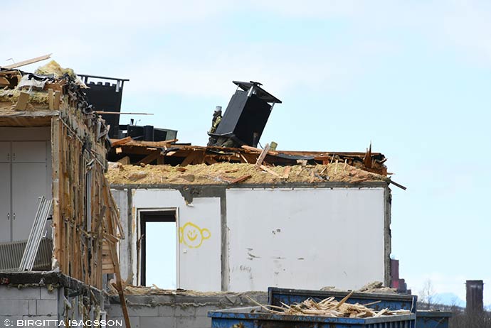 Bilder tagna i förrgår. Nu har rivningen av de kvarvarande husen på Ullspiran börjat.