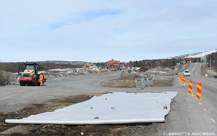 Inför flytten av byggnader under nästa vecka görs en del av Bromsgatan bredare.Likaså avtagsvägen från E 10:an ner till det gamla lastområdet.B 5:an blir den första byggnaden som rullar iväg till sin nya plats vid foten av Luossavaara.Telefoncentralen i onsdags.Dagen därpå återstod bara småbitar av byggnaden.Stadshusets klockstapel och gamla Telegrafstationen på Geologgatan.Stationshuset.Gruvfogdegatan.Ingenjörsvillan och stadshusets klockstapel.